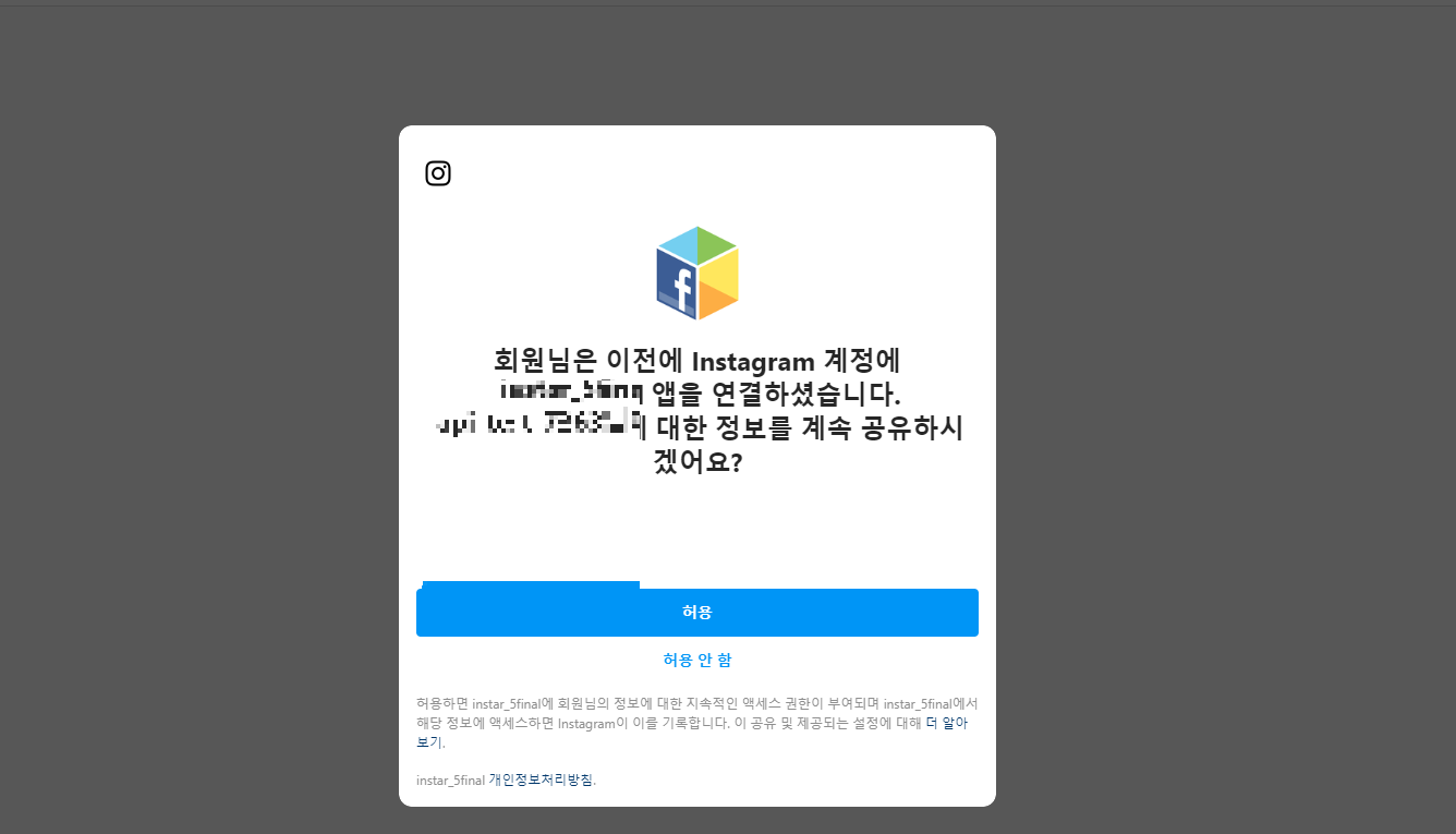만일 문제가 없다면 해당 사진처럼 허용 여부를 물어볼것이다 (띄어쓰기 주의!, 이미 승인한 상황이라 계속 공유할지 물어보는것이다.)