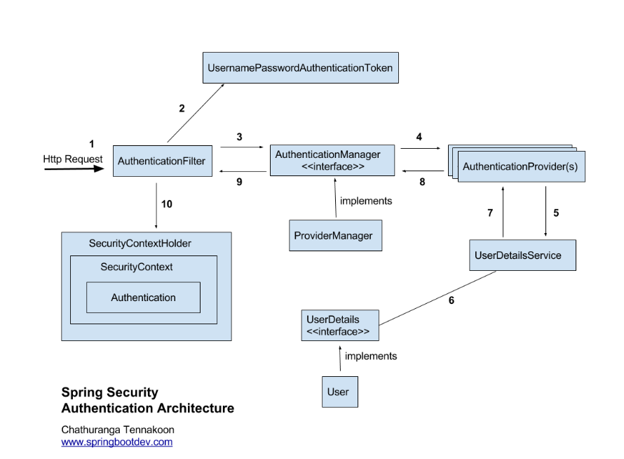 - 인증 절차가 시작되면 AuthenticationProvider 인터페이스가 실행되고 DB에 있는 사용자의 정보와 화면에서 입력한 로그인 정보를 비교