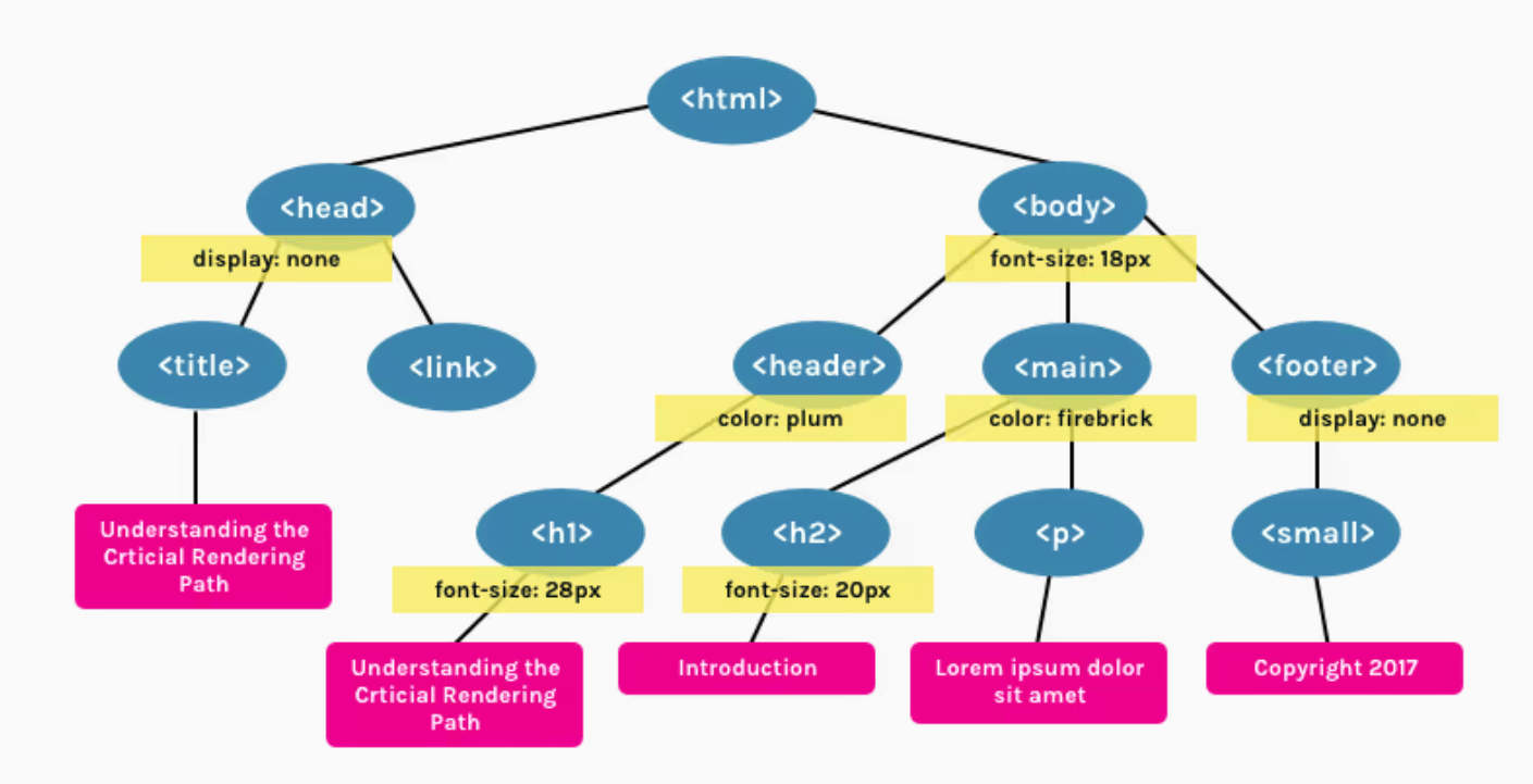 DOM-Tree의 예시 사진이며, 노란색이 CSSOM이다