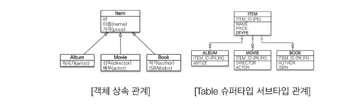 - 상속 받은 객체 (Album, Movie, Book)을 DB에 저장하려면 객체분해를 통해 Album객체를 Item과 분리해야하며 Item Table에 1개, Album 테이블에 2개의 쿼리를 작성해야한다.
