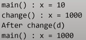 (C)는 x의 값을 바꾸는 것인데 여기선 매개변수가 d.x(지역변수)로 인식되어 change에서 생성한 스택(x)에 값을 넣고 출력하는 것이다. -> 여기서 d.x(지역변수)는 스택 종료시 값이 사라지기 때문에 (B)를 실행해도 기존값인 10이 출력되는걸 알수있다.