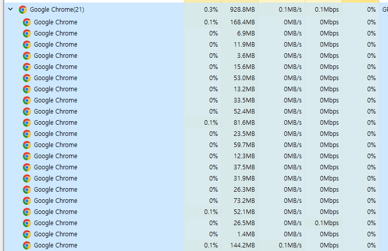 1. 1개의 프로세스는 여러개의 프로세스를 가질수 있다 (사진속 크롬은 21개의 프로세스를 갖고있으며 새로운창 1개만 추가해도 프로세스가 여러개 추가되는걸 볼수있다.)