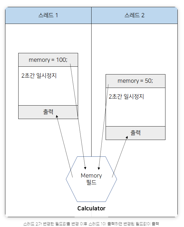현재 Calculator의 setMemory를 본다면 User1이 진행되고 User2가 진행되지만 User2가 User1과 같은객체를 참조하기에 User1과 User2는 같은결과가 나오는것을 확인할수 있다.
