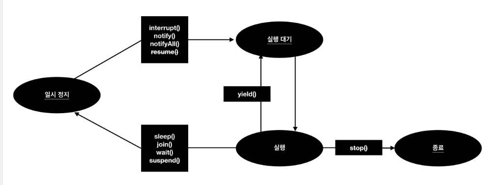 | suspend() | 스레드를 일시 정지 상태로 만든다. resume() 메소드를 호출하면 다시 실행 대기 상태가 된다. - Deprecated(대신 wait() 사용) |