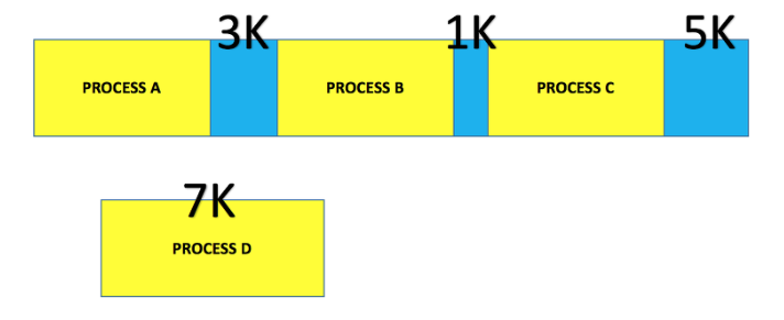 중간에 프로세스를 해제할경우 앞의 빈공간에 할당되는게 아닌 바로 뒤의 연속된 공간에 할당되기에 외부 단편화 발생